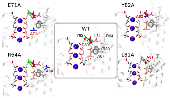 A region near the SF in the different proteins: WT, E71A, Y82A, R64A, and L81A, is shown. With the exception of the mutated residues, the other residues are in the X-ray conformation [28]. Ions are shown as purple spheres interacting with oxygen atoms (red color) of residues in the SF. The key residues are highlighted by different colors, mutated residues are shown in blue.