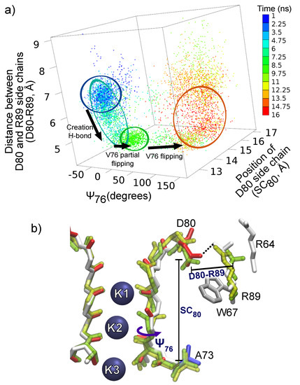 Time series reported in Supplementary Materials (Figure S3) further demonstrated that, in turn, V76 partial flipping affected the permeating K ions, causing an inward shift of the outermost ion K1. Thus, ions’ dynamics are linked with the dynamics of residues behind the filter, D80 and R89. The partially flipped conformation of V76 appears to be unstable and evolved into a complete flipping of V76. The D80–R89 H-bond caused additional small transitions in the TVGYGD sequence until a slight movement of the D80 towards the extracellular side (see Figure S3 in Supplementary Materials and Figure 2b colored to yellow) restored the initial uncorrelated motions of the D80 and R89 (red clouds in Figure 2a) causing a breakage of the H-bond.