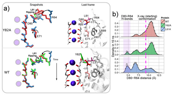 For verifying the regulatory role of L81, mutant L81A (Figure 1) was additionally considered. The probability of the creation of the D80–R64 H-bond was compared for three proteins: WT, Y82A, and L81A. All the proteins were simulated with the same initial configuration, and the probability was calculated for the same time interval 10 ns. Consistently with the presented above results, the simulations confirm that the rate of the H-bond creation depends on residues L81, with a trend in the probability L81A > Y82A > WT (Figure 3b). The probability is larger in Y82A with respect to the WT by the enhanced fluctuations of L81. The probability becomes even larger in L81A when L81 is directly substituted by the small alanine which interferes less with R64 motion.