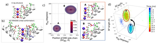 Panels (a,b) compare of the X-ray structure of the WT protein (a) and the initial configuration for simulation WT-R64D80 (b). Panel (c) shows the correlation between the states of D80 and the SF by means of the two-dimensional probability density for position SC and angle (see “Methods”) during first ns of simulation WT-R64D80, i.e., before ion configuration KwK0K was reached. Two meta-stable states are denoted by letters A and B. Snapshots corresponding to each of the two states are shown on the right side panels. State A is the initial state in which E71-D80-W67 linkages were present. State B is characterized by an outer movement of D80 which followed by the break of E71-D80-W67 linkages and TVGYGD rearrangements. Panel (d) reports time evolution of subunit C in the conformational space defined by (i) , (ii) SC, and (iii) the length of the TVGYG sequence, SF length. The trajectory in the conformational space is coded by color scale shown in the colorbar. Letters A and B indicate the same states as in panel (c).