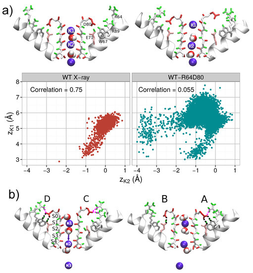 Panel (a) illustrates the correlation of the position of permeating K ions (K1 and K2) for two different conformations of WT: (i) the X-ray conformation in which R64 was far from D80 in all subunits; and (ii) the confirmation used in simulation WT-R64D80 with R64 near D80 in all the subunits. Only a part (durations of 7 ns for (i) and 15 ns for (ii), respectively) of the simulations with identical filter occupancy wKwKw+K were considered. For simulation WT-R64D80 the part corresponds to broken E71-D80-W67 H-bonds. Representative snapshots and z-positions of two ions in the SF on the state plane of and for each configuration are shown. Panel (b) depicts a configuration of the channel after the inward transition of the innermost ion K2 (wKwKw+K ⇄ wKw0K+K) occurred. All four subunits denoted by letters A–D are shown.