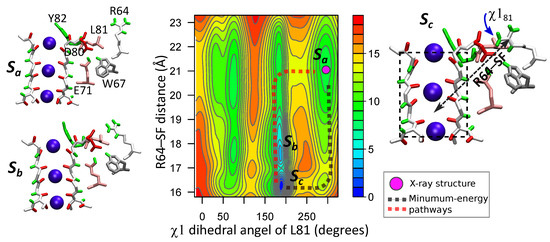 In the middle, two-dimensional FES computed via the wt-metaD approach is shown with respect to the distance between R64 and the SF (R64–SF) and angle . In order to aid the visualization, angle is reported in the range , instead of the standard . The FES is shown in kcal/mol, lines in the contour plot are drawn every 1 kcal/mol. Configurations of residues for three different multi-stable states: , and , are shown on the sides of the FES plot. These three states are denoted on the FES. State is with non-flipped residue L81 and close to the X-ray structure of KcsA. L81 is in the flipped conformation for states and . Residue R64 forms a H-bound to D80 in the state . The global minimum of the FES is state .