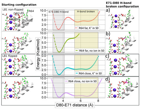 If an ion is absent in site S0 and simultaneously R64 is far from D80 (Figure 7b), the E71–D80 H-bond is the only stable state in the FES. However, the proximity of R64 to D80 makes breaking the E71–D80 H-bond possible and leads to new meta-stable states without the bond (Figure 7d). The energetic barrier for the breaking the H-bond is relatively small (around 2.5 kcal/mol) and slightly higher (by 0.2 kcal/mol) than the barrier for re-establishing the H-bond. These new states without the interaction between E71 and D80 are close to those that led to distorted configurations in the SF observed during simulation WT-R64D80.