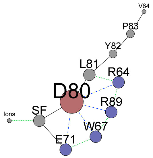 The summarized complex picture provided by this research can be represented as a network of weighted nodes which affect the permeation path (Figure 8). The sizes of the nodes are weighted according to the number of edges connecting each node. This figure reveals the primary importance of the residue D80, being the main hub. It forms the core of the network with the neighbouring H-bond donors E71, W67, and arginines R64 and R89 which mutual dynamical influence defines states of D80. The collaborative dynamics of the residues result either in the stabilization of the conductive conformation or in distorted states of the TVGYGD sequence of the SF. Note that the sequence belongs to the highly conserved signature sequence TXXTXGYGD observed in many potassium channels [16,29,31,97]. In these channels, the aspartate residue D, similar to D80 in KcsA, is surrounded by different H-bond donors. Thus, the existence of similar complex network might be a general feature in the regulation of the current in the K ion channels.