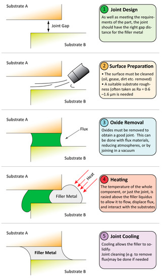 Joining is vital in the assembly of components when products cannot, due to size or material requirements, be fabricated as a single piece. Joining technology, applied in industries as diverse as electronics, aerospace, automotive, and energy, offers a wide range of different techniques, each with particular characteristics, which will determine their suitability for a certain application. Among these, brazing and soldering offer the principal advantage that they are capable of forming a metallurgical joint between widely dissimilar substrate materials (the parts being joined) with minimal modification of those materials [1,2,3]. In both brazing and soldering processes, a molten filler metal is used to form a metallurgical bond between two (or more) components (the convention is for the two methods to be distinguished by a watershed of 450 °C). It is important to note that in brazing and soldering, the filler metal is a more distinctive alloy than the filler metals used to make up joint volume in a number of fusion welding processes; in that case, the filler metal usually has a similar composition and melting point to the materials being joined, while in soldering and brazing, the filler metal is the only part of the joint that melts. It is heated above its liquidus temperature and allowed to wet (and often flow between) the components it is being used to join. Once in the correct position, the filler is allowed to cool to a solid state, forming a metallurgical bond adhering the components together [4,5,6]. The key steps in joint formation by these techniques are shown in Figure 1.