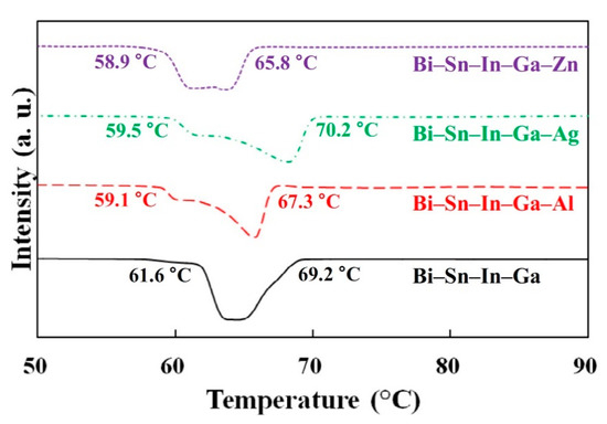 To overcome such limitations, other solders, such as those based on the Sn-In eutectic, have been explored. These exhibit excellent ductility, flexibility, and high thermal and electrical conductivity, and are regarded as promising materials for soldering heat sink components for flexible devices [7]. However, their relatively low mechanical strength and melting temperature still need improvement for more effective use in areas such as flexible interconnection applications, and this has led to the exploration of some complex compositions. For instance, alloys explored include some close to HEA compositions including quaternary Sn-Bi-In-Zn [33], and Bi-Sn-In-Ga and quinary alloys formed from this by adding Zn, Ag, and Al [34]. Figure 2 shows Differential Scanning Calorimetry tests on these alloys, indicating the effect of the fifth element on the melting point.