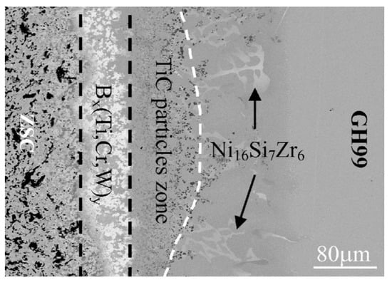 A cross section through a joint formed between ZSC and GH99 superalloy, using CrFeCoNiCu and Ti foils, at 1180 °C, 60 min. Reprinted from [35], with permission from Elsevier.