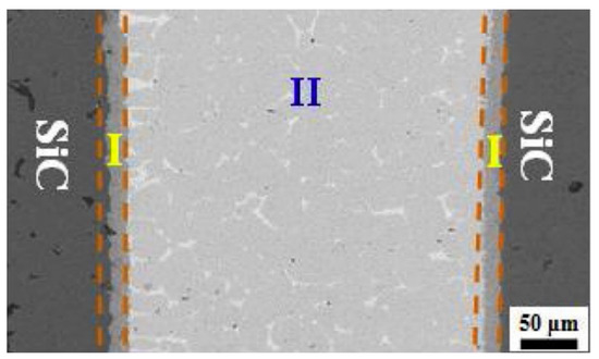 A cross section through a joint formed between two pieces of SiC, using CrFeCoNiCu alone as the filler, at 1180 °C, 60 min. (I) Denotes the reaction layers and (II) the main joint seam. Reprinted from [39], with permission from Elsevier.
