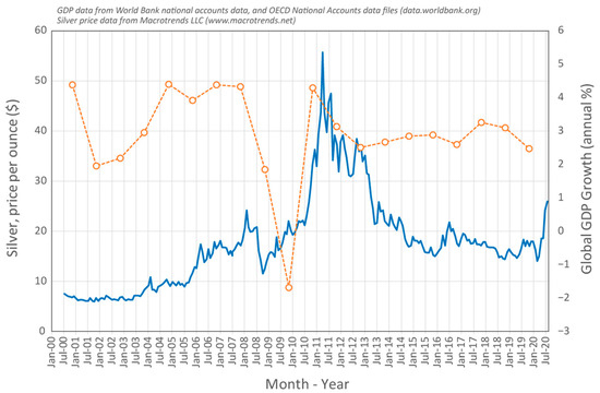 Historical data for the commodity price of silver (in USD per ounce), which impacts the cost of purchasing the metal and the value of the alloys it is used in. The data for global GDP growth are shown for comparison, to illustrate the correlation with one of the factors that contributes to price rises for Ag.