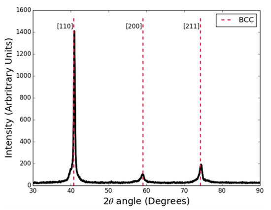 The investigation into the Ag-Cu-Zn-Mn system covered many compositions, including many that did not meet all of the rules often used to define HEAs. The results showed that with careful calibration of the elements, the properties (atomic size difference and enthalpy of mixing) could be adapted to allow much greater quantities of zinc to be included in the alloy without the formation of intermetallics being predicted. One of optimum alloys in this regard was Ag37-Cu14-Zn45-Mn4 at. %. The alloy was produced from 99.9% or better purity elements by induction melting and examined in XRD (Bruker D2 Phaser and a Cu Kα source), Figure 6, and, to the resolution of the system used, shows only a single phase Body Centered Cubic (BCC) structure.