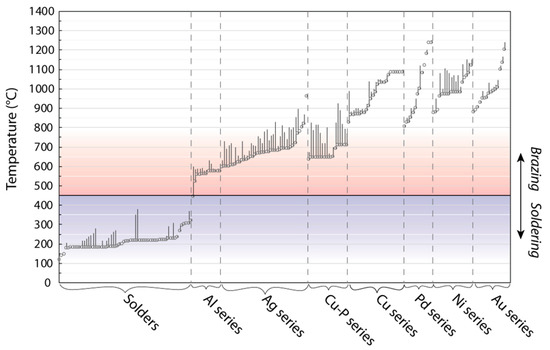 The melting characteristics of standard soldering and brazing filler metals, split into the families used in the standards. The plotted point is the solidius, and the vertical line represents the melting range until the liquidus temperature is reached. The low number of available fillers around 350–500 °C is clear. Data for brazing filler metals are from ISO: 17672 and for solders from BS EN ISO 9453.