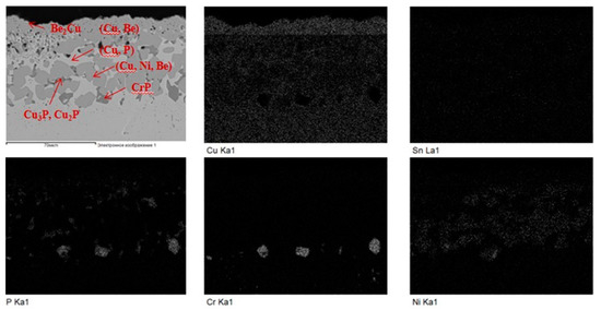 Brazing is frequently used where the materials are dissimilar, where the components are complex with different part sizes, and also where the operating conditions will be severe. An example that imposes all of these conditions is in the plasma facing components (PFC) of the International Thermonuclear Experimental Reactor (ITER) [85,86]. In the PFC, brazed joints can be found in the first wall, limiter, baffle, and divertor components [87,88]. There are different armor material candidates for the PFC, including beryllium and tungsten (in both cases to be joined with Cu alloy heat sink materials) [86,89,90]. These joints must have good physical and mechanical properties, and maintain these after the irradiation and cyclic heat fluxes without degradation. Be has some advantages as an armor material (low atomic number, which can significantly improve the plasma performance [86], relatively high thermal conductivity, low tritium retention, and low activation in the reactor [86,91]). However, Be reacts with most elements at elevated temperatures, leading to the formation of brittle intermetallic phases, which makes brazing difficult and reduces joint strength and ductility [87]. The reactivity of Be with Cu is especially high, and intermetallic phases can form at 350~400 °C [87]. Only few elements commonly included in fillers (Al, Si, Zn, Ag, and Ge) do not form stable beryllides below 760 °C [92]. An example of the typical microstructure of a joint formed between Be and CuCrZr using a Cu-9.1Ni-3.6Sn-8.0P filler (STEMET 1101) is shown in Figure 11, indicating the different phases present.