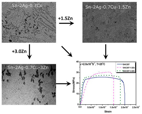 The effect of Zn content on the microstructure and tensile strength of Sn-2Ag-0.7Cu. Reprinted from [107], with permission from Elsevier.