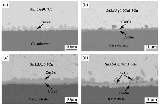 Morphologies of as-reflowed (a) Sn-Ag-Cu/Cu and (b) Sn-Ag-Cu-Ga/Cu interface, (c) Sn-Ag-Cu/Cu and (d) Sn-Ag-Cu-Ga/Cu interface aged at 180 °C for four days. Reprinted from [105], with permission from Elsevier.