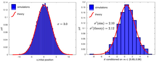 - Measurement. In order to perform a measurement in the simulation, a Gaussian number “r” with zero average and standard deviation 1 is generated. Subsequently, if particle position is x, the measurement outcome m isNotice that m is then distributed according to Equation (6)