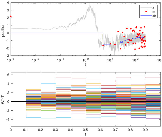 Confinement. Top: particle trajectory (gray line), measurement outcome (red dots) and trap center position (blue line). Bottom: Cumulative work for different realizations (color lines) and its average over 200 realizations (thick black line) for confinement in 10 measurement steps. See the simulation details in Section 5. Initial trap stiffness and position . Initial condition is equilibrium with trap potential to avoid transient due to equilibration. Particle diffusion coefficient and friction .