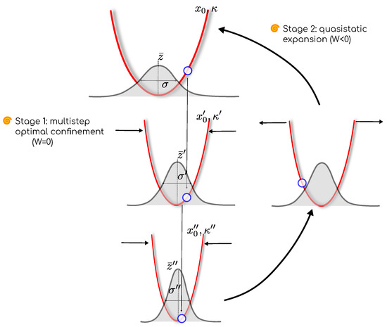In general, for other feedback protocols where the stiffness of the trap is suddenly changed, work is performed, on average [21], as in the simple example described after Equation (2). The feedback process used here is different (in addition to a sudden increase of stiffness, trap position is also modified in a precisely combined manner) and it is special in the sense that average work vanishes. As encoded in Equation (1), this can solely be achieved by using information regarding the position through measurement in the feedback (see Equation (9) for the new trap position). To see why this matters, consider our Brownian particle in a harmonic potential, where the observer happens to know that the particle is exactly at the bottom of the well. This would allow for this external agent to increase the stiffness of the potential well with an abrupt change, without performing work, since the energy of the particle is always zero at the bottom of the well, for any stiffness. The confining protocol is a refinement of this idea that works for any position of the particle, by displacing the bottom of the potential well towards the measured particle position and changing the stiffness in a suitable manner.