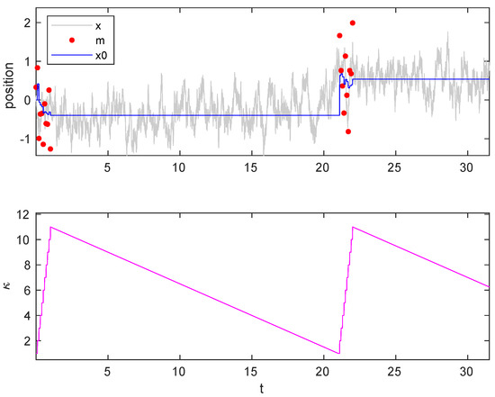Trajectories. (Top) Particle trajectory (gray continuous line), trap center (blue continuous line), measurement outcomes (red dots). (Bottom) Stiffness evolution during the cycle. Every cycle starts with , there are 10 measurement steps, followed by quasistatic expansion. , .