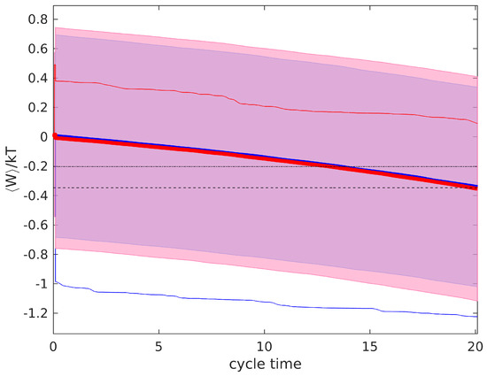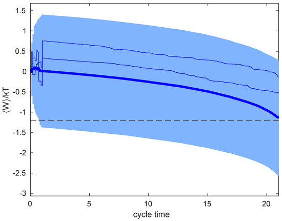 Figure 5 shows the cumulative work that was done on the system along the time of a single cycle. The thick solid line represents the average over 200 cycles. Every cycle consists of a confinement that is achieved by measuring the particle position 10 times and the subsequent isothermal expansion. Average work extracted () by the end of the cycle approaches the expected result that is given by Equations (18), (19) and (21), marked with dashed black line. The shaded area represents the variance of the work, which is substantially large. As is apparent from the figure, most of the variance comes from the confinement step, with the quasistatic work being a self-averaging quantity. Finally, work that corresponds to two particular cycles is shown by thin blue lines.