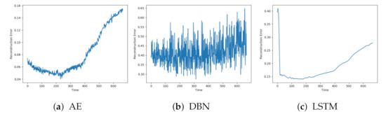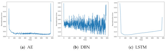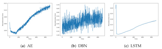 Figure 7a–c shows the reconstructions from AE, DBN, and LSTM on a sequence with fault A. The individual models were affected by similar patterns of noise. The AE and LSTM both start with a low reconstruction error, which increases towards the end of the sequence. It is hard to see any clear trend from the DBN due to the high noise level.