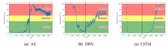 Figure 12a–c shows the achieved anomaly score from the AE, DBN, and LSTM model, on one of the sequences with fault type A in the configuration set. The normal zone is represented by green, the warning zone by yellow, and the red is the danger zone. The fault is introduced over three levels of severity. The black vertical line in the figures indicates when the fault has 100% severity. The idea with anomaly detection is not about predicting that something is about to fail but to give insight into the current condition. In particular, fault A is according to the available sensor measurements resulting in long-term changes, not sudden impact. The AE starts with an anomaly score close to zero, before gradually increasing towards a peak, then it decreases slightly. The DBN starts with a high anomaly score. It decreases down to the normal zone before increasing towards the danger zone, reaching it just before it fails. The LSTM model starts similar to the DBN but quickly finds the normal level before gradually increasing after the 100% error is introduced.