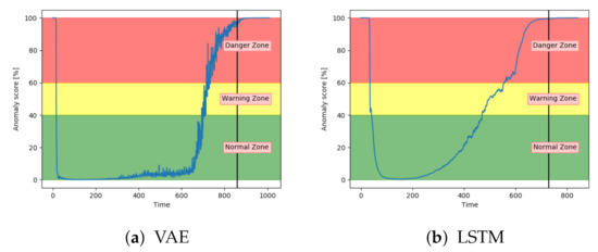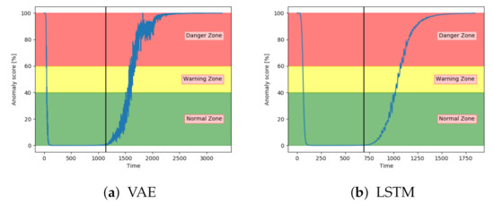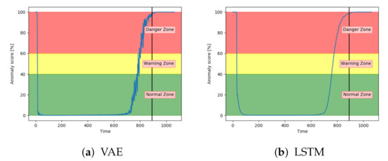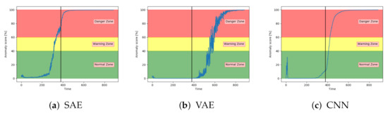 Figure 13a–c show the anomaly score obtained from the SAE, VAE, and CNN models on a sequence from the configuration set with fault type B. The results show that the three models start in the normal zone and increases. The main difference between them was that the VAE and CNN increase towards the maximum score later than the SAE.