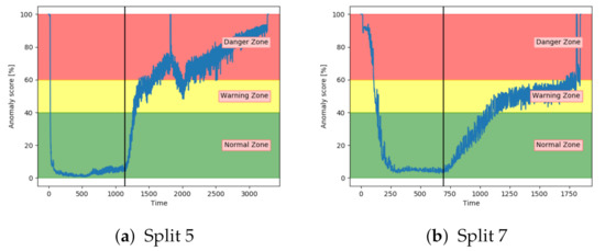 Figure 20a,b show that both the AE and SAE achieved the desired trend of the anomaly score. For both models, it stayed in the normal zone before gradually increasing up to an anomaly score of 100. Compared to the other models, the results from the AE and SAE started with a longer period in the error zone, before reaching the normal zone. This can either be because of how the sequences are logged or a problem with these models.