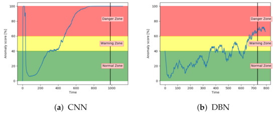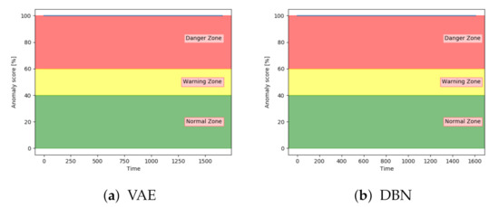 Figure 19b, the anomaly score from DBN was not able to increase into the danger zone until right before failure. Compared to the other models, the anomaly score from DBN lies much higher in the normal zone and much lower in the danger zone.