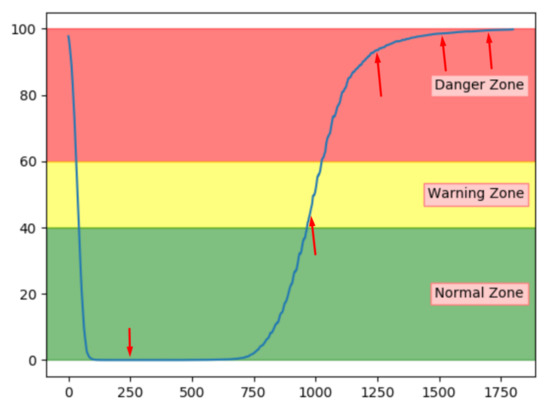 The reconstruction error can be transformed into a more descriptive range between 0 and 100, referred to as an anomaly score. An anomaly score of 100 indicates faulty behaviour, while 0 indicates a normal condition. The range is divided into three zones, which represent the state of the system. These are normal, warning, and the danger zone. The next section describes how transformation and thresholds are decided.