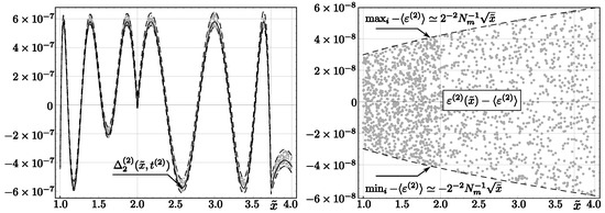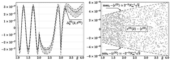 In the case of the second correction, we keep the obtained value and determine the parameter , which equates the maximum value of the error with the modulus of its global minimum. is increasing (decreasing) with respect to negative (positive) and has local minima that come only from positive maxima and negative minima. Therefore, the global minimum should correspond to the global minimum or to the global maximum . Substituting these values into Equation (A2) in the place of , we obtain that deeper minima of come from the global minimum of the first correction: