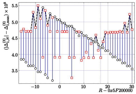 Maximum relative errors for the first Newton–Raphson correction in the code InvSqrt3 as a function of R in the case of and . Circles denote maximum errors (), while squares denote minimum errors (). The maximum error (shown by the dashed line) was determined by minimizing the maximum error for all floating-point numbers from .