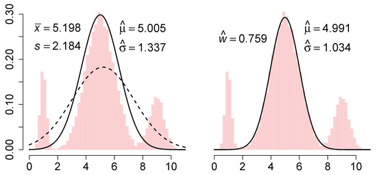 Robust estimation for the parameters of the normal distribution as in Equation (2) is a well-studied topic. In particular, the likelihood is modified so as to avoid the use of the non-robust squared errors found in Equation (3). For example, may be modified to be bounded from above, or may even take a more extreme modification to have redescending shape (to zero); see [1,2,3]. Either approach requires the specification of meta-parameters that explicitly control the shape of the resulting influence function. Typically, this is done by an iterative process where the residuals are computed and a robust estimate of their scale is obtained. For example, the median of the absolute median residuals.