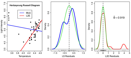 (Left) MLE (blue) and L2E (red) regression estimates for the Hertzsprung–Russell data; (Middle) kernel (blue) and normal (green) densities of the least squares residuals; and (Right) kernel (red) and normal (green) densities of the L2E residuals. See text.