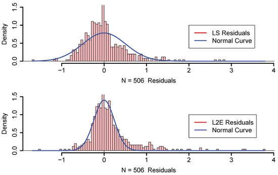 In Figure 3, we display histograms of the residuals as well as a normal curve with mean zero and the estimated standard deviation of the residuals. The estimated value of is 0.509 and for LS; however, is only 0.240 for L2E, with . Examining the curves in Figure 3, we see that the least-squares model tends to over-estimate the median housing value. Our interpretation of the L2E result is that the simple multiple linear regression model only provides an adequate fit to at most 84.5% of the data. (This interpretation relies critically on the correctness of the proper shape of the residuals following the normal distribution.) In particular, the L2E model is saying that very accurate predictions of the most expensive median housing census tracks are not possible with these 13 predictors.