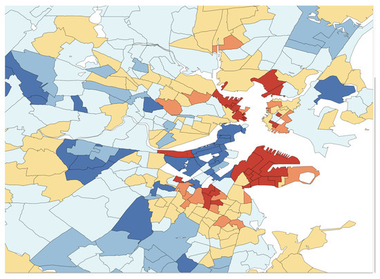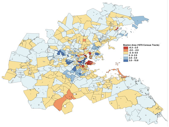 In Figure 4, the L2E residuals (in standardized units) are displayed for the 506 census tracks. The dark blue and dark red shaded tracks are more than 3 standard units from their predictions. The expanded scale shown in Figure 5 shows that the largest residuals (outliers) are in the central Boston to Cambridge region. Similar maps of the LS residuals show much less structure, as is apparent from the top histogram in Figure 3.
