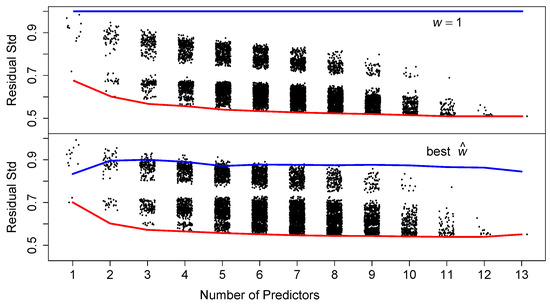 Fitting all possible subsets of predictors for the median housing values (). The red lines connect the best model for each number of predictors. The blue lines connect the best w for that best model. Of course for all least-squares models. See text.