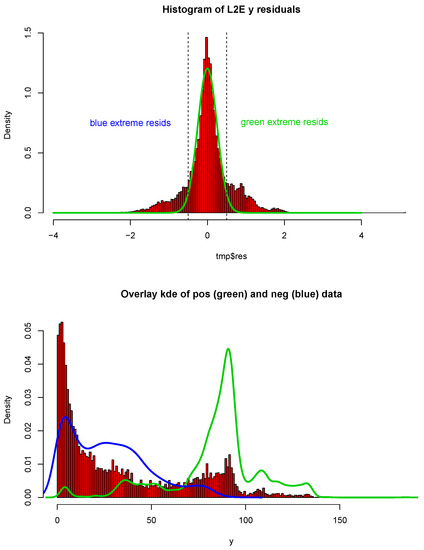 In the right frame, we examine the residuals from the L2E fit. We begin by noting that the fraction of “good data” is around 92%, indicating 3.8 outliers. The kernel density estimate of the residuals is shown in red. The fitted normal curve to the residuals is the partial normal component given by