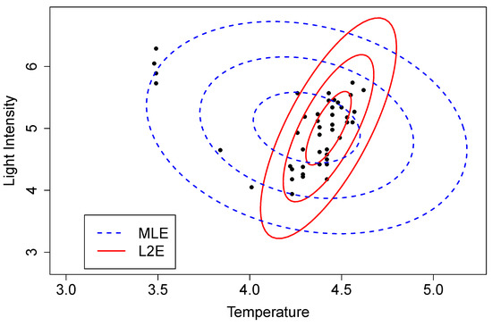 To illustrate this approach, we computed the MLE and L2E parameters estimates for the Hertzsprung–Russell data [11]. The solutions are depicted in Figure 10 by three level sets corresponding to 1-, 2-, and 3- contours. These data are not perfectly modeled by the bivariate normal PDF; however, the direct regression solutions shown in the left frame of Figure 2 are immediately evident. The estimate of here was 0.937, which is slightly larger than the estimate shown in the right frame of Figure 2.