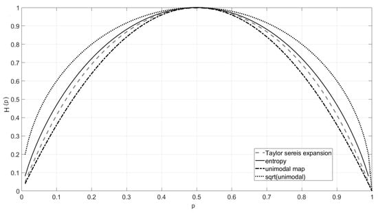 The form of entropy H was derived under assumptions of monotonicity, joint entropy, continuity properties, and Grouping Axiom. In the classical case of the entropy rate for the Markov process, in Formula (11), the terms and are clearly understood in the Shannon sense (2). To ontain a better insight into the asymptotic behavior of the relations studied in this paper, I additionally consider Formula (11) with H replaced by its Taylor approximation (10 terms). I also studied the interesting case when instead of H, I used a well known unimodal map [] which is, in fact, close (Figure 1) to H in the supremum norm []. This idea is along the research direction related to generalized concepts of entropy developed, starting from Renyai [], by many authors [,,,,]. Figure 1 shows the approximation of entropy (11) by polynomials: unimodal map (black dash line) and 10 first terms in the Taylor series of H (gray dash-dot line). I also included the square root of the unimodal map (black point line) in this figure.