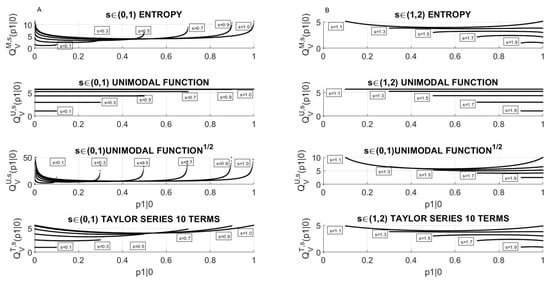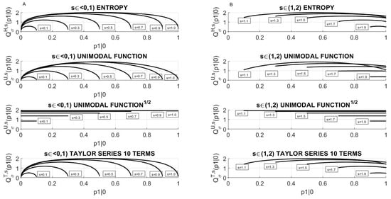 The quotient as a function of the transition probability for chosen values of the jumping parameter s: (A) For parameters due to (16) the range of is and (B) for according to (17) the range of is . The courses of the quotients for Shannon form, unimodal map, unimodal map root, Taylor series being applied as H in Formula (9) are presented.
