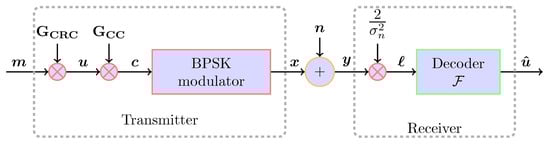 Consider the block-wise transmission scenario of CC through the additive white Gaussian noise (AWGN) channel, see Figure 1. Prior to transmission, the message word is encoded twice: By an error detection code and by an error correction code. The CRC encodes with systematic generator matrix . Its parity check matrix is . We denote the detection codeword by and the codebook with . Then, the CC encodes with generator matrix . As a result, the codeword is a bits sequence with where denotes the rate of the CC. For brevity, we denote ; the length of the CC calculated as .