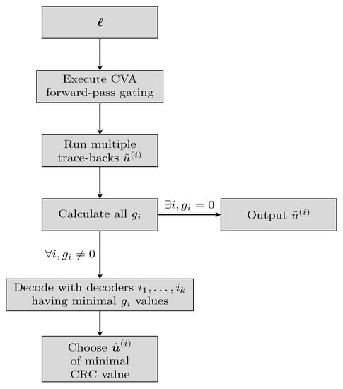 First, a forward pass of a CVA is executed on the input word ℓ, as in Equation (4). As all states are equiprobable, the initialization is chosen as instead of Equation (5). After calculating for every state and stage, the trace-back runs times, each time starting from a different state. The starting states are spread uniformly over , with the decoded words given as