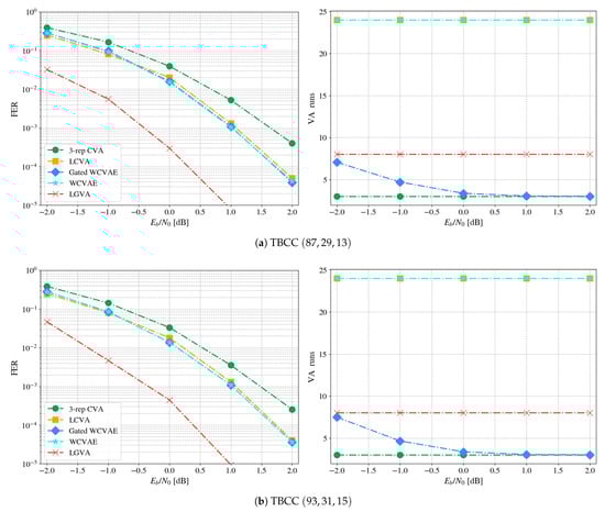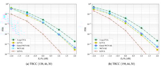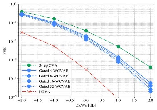 - List genie VA (LGVA)—an LVA decoder with list of size , that runs from a known ground-truth state; The optimal decoded codeword is chosen by the CRC criterion. The FER of the gated and non-gated WCVAE are lower bounded by this genie-empowered decoder.
