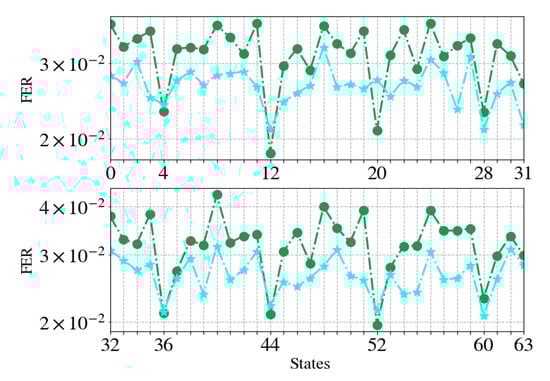 We provide further insights to the benefits of training by studying the performance of the trained specialized decoders versus their non-trained counterparts. We fixed the code to TBCC and the SNR to 0 dB. Figure 6 depicts the FER as function of the termination states, each subplot shows two decoders: The classical CVA and the trained WCVA. The ith classical CVA had 3 repetitions, as before, and ran trace-back from state . The trained WCVA is the ith decoder of the WCVAE, responsible for decoding states . It ran trace-back from the same state. At each point, codewords of the given state, and only this state, were simulated until 250 accumulated errors.