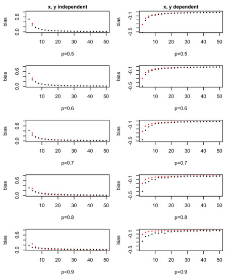 Similarly, when , from Equation (2), . So, there are circumstances, when X is not a noise variable, and X, Y are dependent, that we have a negative bias. It is opposite to the situation for independent variables. For , more missing values means a smaller bias for this informative variable X, thus with a smaller entropy real gain. In that case, informative variable X with more missing values has less chance to be chosen.