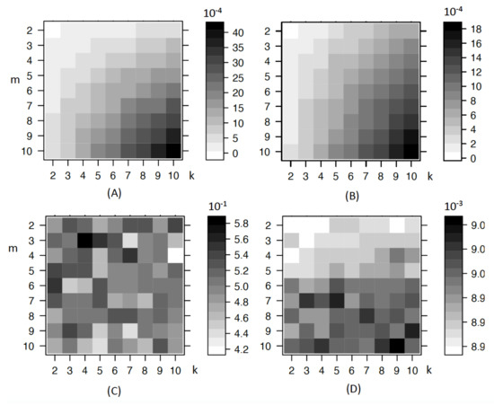 Bias when number of categories or values in X and Y changes. The four subfigures are the bias of , respectively, at top left, top right, bottom left and bottom right. Here, the x axis label k is the number of values or categories in response variable Y and the y axis label m is the number of values or categories in explanatory variable X. The darker the shade, the higher the bias.