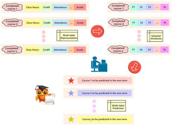 Firstly, the framework we proposed establishes a multi-label representation model from the completed courses. For example, course 1 contains several crucial information features, such as the number of hours, credits, attendance, and mid-term and final grades. The second step is the attribute reduction process. Due to the large amount of feature information, some features may be weakly correlated with the predicted label, or have high repetitive feature importance. Therefore, after attribute reduction, features with more attribute representation ability and predictive value are retained. The last step is to perform multi-label prediction.