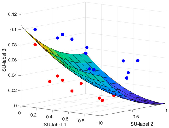 The red circles (features) and blue circles (features) are redundant, and since the blue features have a higher FD value, they have more information that leads to the elimination of the red features. For a better understanding, a Pareto optimal front, resembling a spherical surface, is drawn, which separates the dominant and non-dominant features.
