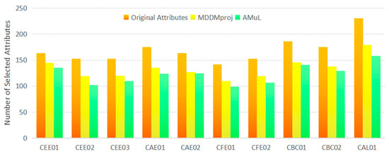 In order to prove the effectiveness of AMuL, we compare our algorithm with MLNB [51], MDDMproj [52], MLFRS [53], MFNMI [54], RF-ML [55], and AMI [56]. Figure 4 shows the comparison of the number of selected features in the original attributes, MDDMproj, and AMuL. It can be seen that, compared with the number of original attributes, MDDMproj and AMuL obtained a more streamlined feature set through attribute reduction. On average, our proposed AMuL method has a higher reduction rate than MDDMproj in most professional data samples. Thus, a question emerges as to whether it possesses the same predictive accuracy on a more condensed feature set. For the sake of fairness, we used the reduced feature set of the above six comparison methods for classification. We then used a fivefold cross-validation method in the experiments to record the best results of the parameters in terms of classification performance. The different class groups k were set to 10 in order to prevent overfitting of the data, and to balance the complexity of the model according to the literature [57]. All methods were fully implemented in MATLAB and tested on a PC equipped with an 8-core 1.80 GHz Intel Core processor and 16 GB RAM.
