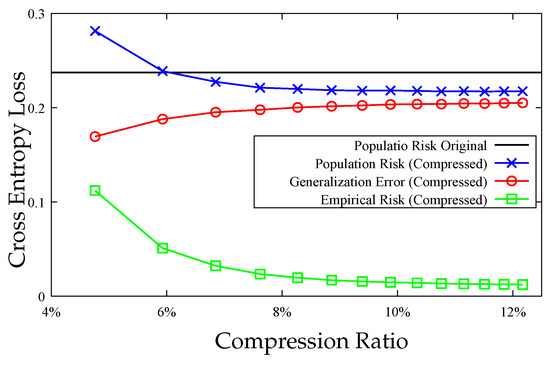 Population risk of the compressed model and the original model W vs. compression ratio (ratio of the number of bits used for compressed model to the number of bits used for original model). The generalization error of decreases and the empirical risk of increases with more compression (smaller compression ratio). The population risk of is less than that of W for compression ratios larger than 6% in this figure. As the compression ratio goes to 100% (no compression), the population risk of will converge to that of the original model W.